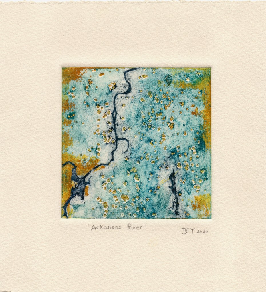 The work below is the Arkansas River from space. This sort of work moves me toward the abstract and helps me exercise less restraint on my colour combinations.
